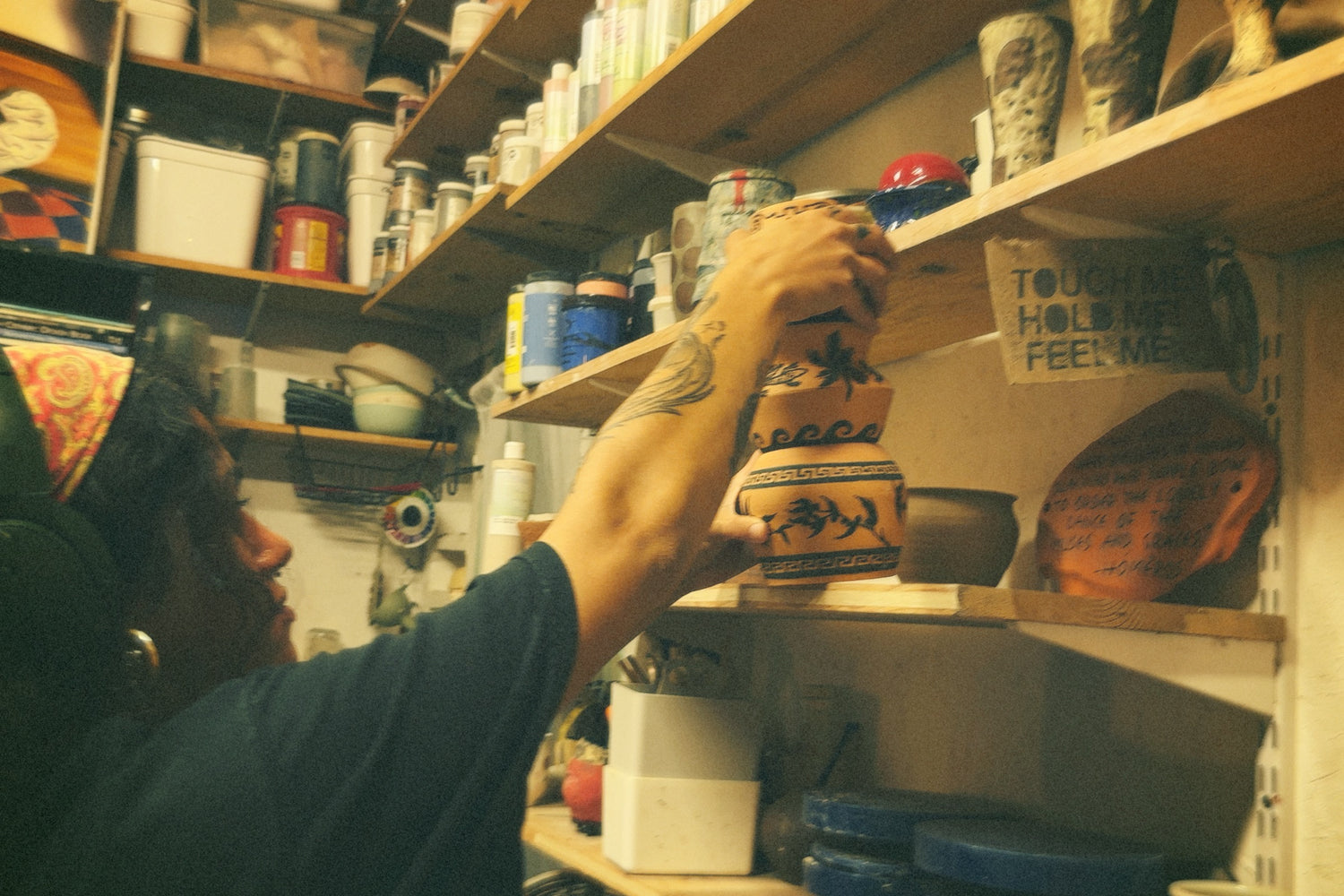 aggeliki (she/her) is mexican-greek artist born and raised in south florida. she has been working with clay for 4 years and is deeply inspired by her mexican heritage and iconic grecian vessels. aggeliki uses ancient myth and contemporary rituals to inspire her art, which ranges from wall tiles to functional pottery and figurative sculpture.