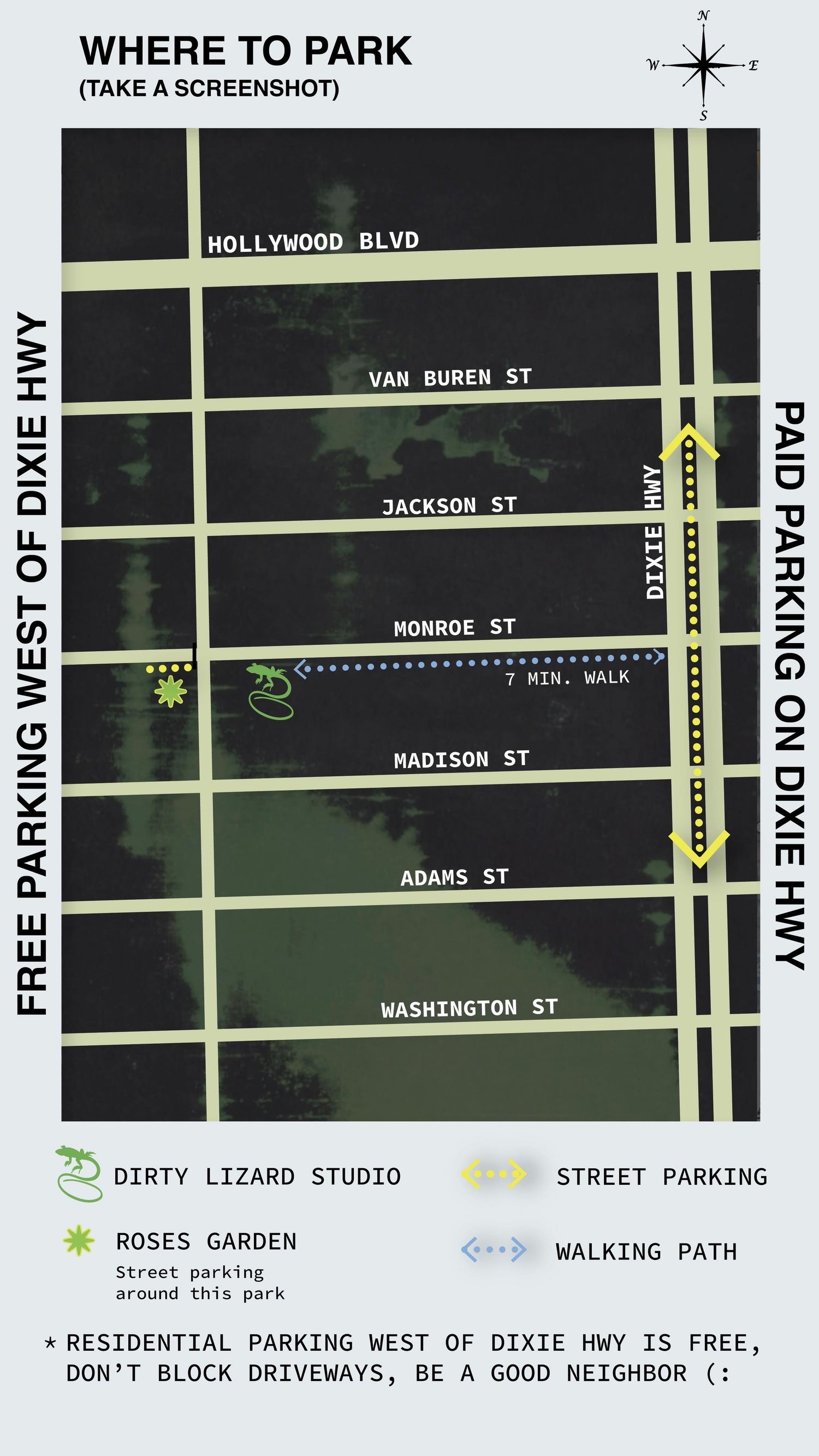 THERE IS AMPLE PARKING AVAILABLE ON THE END OF MONROE ST NEXT TO ROSE’S GARDEN. TAKE 26TH AVENUE TO MONROE ST AND TURN EAST (left if coming from i95), DRIVE ALLLLLL THE WAY DOWN TIL YOU SEE THE PALM TREES / BARRICADE.