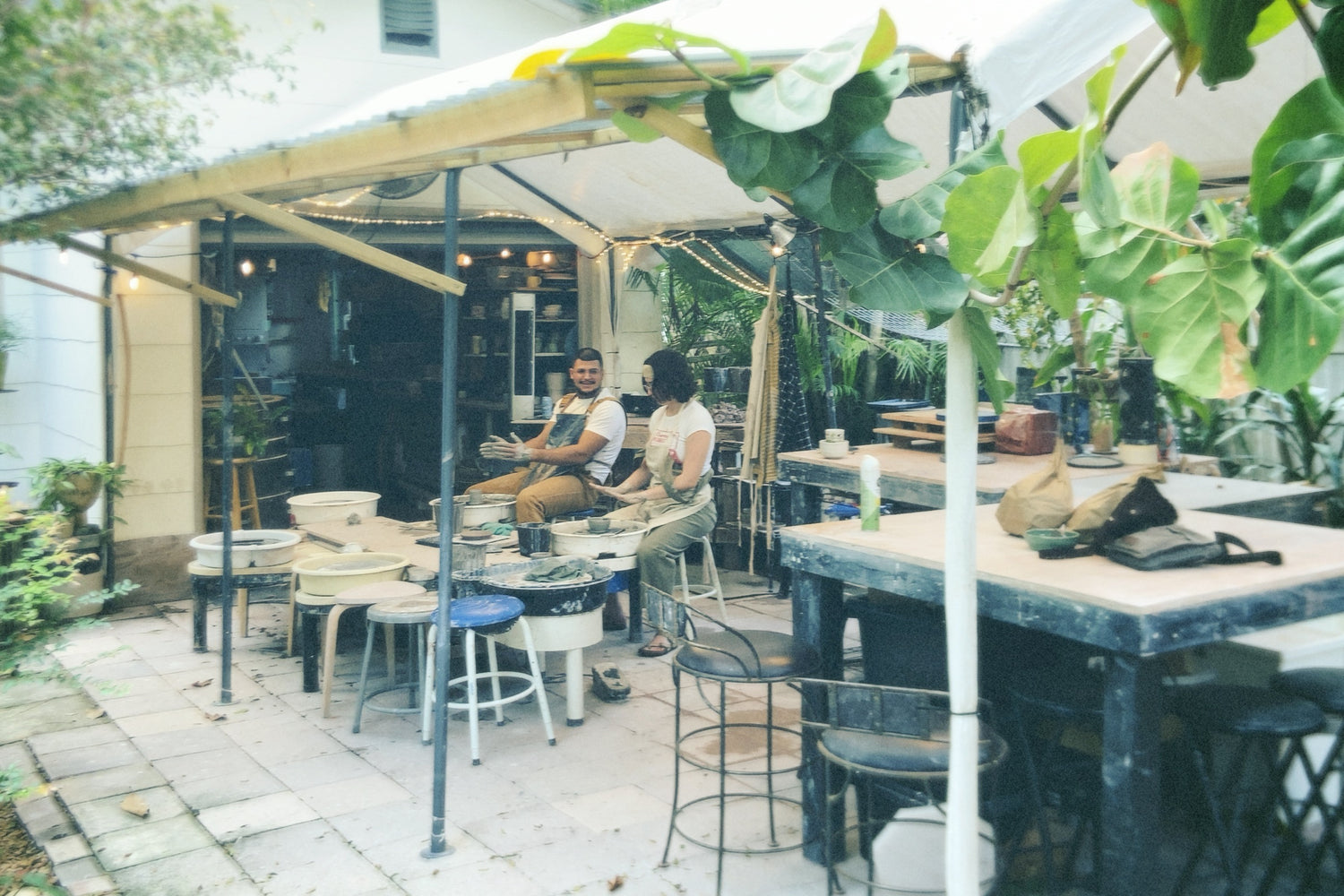 the studio is outdoors, under cover in full view of our tropical garden. think warm light, lots of plants, jazzy funky tunes, and plenty of comfy spots to chill and imbibe in the garden if you’d like 🌿